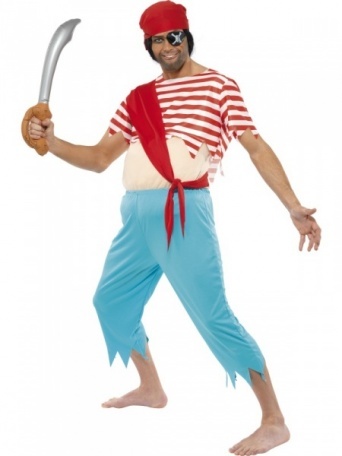 Kostým nebezpečného piráta se skvěle hodí na karnevaly či tématické večírky. Součástí kostýmu je pruhované tričko s břichem, modré kalhoty, červený pásek a červený šátek na hlavu.