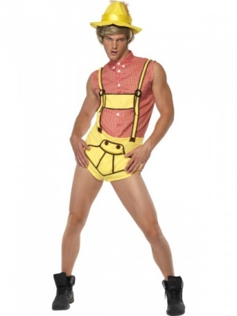 Kostým obsahuje žluté kraťasy, červená kostkovaná košile a klobouk.