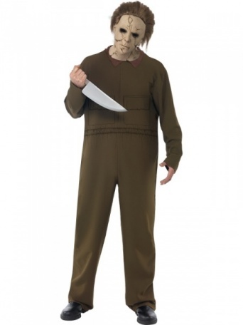 Strašidelný kostým Michaela Myerse, vraha z hororu Hallowen se skládá z hnědo-zelené kombinézy a gumové masky na obličej.